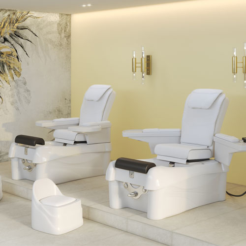 O conjunto de pedicure SPA OMEGA é composto pela cadeira SPA OMEGA e uma cadeira de altura baixa (25 cm) para profissional de pedicure.