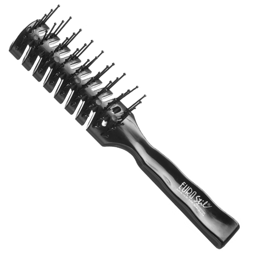 Escova de plástico com bolinhas na ponta para não machucar o couro cabeludo.
