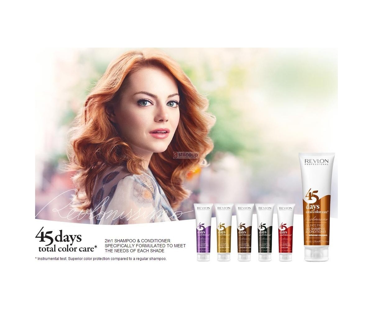 Revlon 45 Days Brave Reds 275ML.A coloração dos cabelos pintados tende a desvanecer com o acumular das lavagens, tornando-se baça e pouco intensa. Para evitar que isto aconteça, a Revlon criou a gama de champôs/condicionadores 45 days total care 2 em 1, que possuem uma fórmula específica e adaptada para cada tom de cabelo! Além de acondicionar o cabelo, que geralmente se pode encontrar mais fragilizado após a coloração, este cuidado contém uma tecnologia única que permite acumular pigmentos na fibra capilar, e compensar dessa forma a perda progressiva da cor entre lavagens.